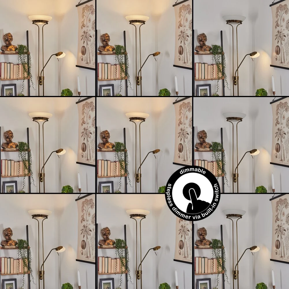 Diese Stehleuchte verfügt über einen An-/Ausschalter am Gehäuse, sowie einen Tastdimmer.