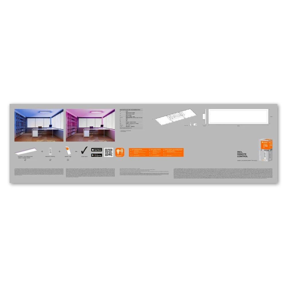 - Smart Panel mit Haupt- und Hintergrundbeleuchtung mit WIFI-Technologie TW RGB und dimmbar. Produkteigenschaften. Steuerbar über LEDVANCE SMART+ WiFi App (mit mindestens Android 4.4 oder iOS 9.0). Steuerung über Google Assistant oder Amazon Alexa möglich. Dimmbar. Netzwerkprotokoll: WiFi. Farbtemperatur über Tunable White einstellbar: 3.0006.500 KProduktvorteile. Einfache und schnelle Installation. Hauptlicht und Rücklicht. Beide Lichter sind unabhängig. TW und RGBAnwendungsgebiete. Innenraumanwendungen. Küche, Wohn-, Kinder- oder Arbeitszimmer. Technische Ausstattung. Tragbügel enthalten. Inklusive Montageschrauben und Dübel. Steuerung über App oder Sprachsteuerung erfordert kompatibles Smart-Home-System. Für die Steuerung über LEDVANCE SMART + WiFi App ist ein Smartphone oder Tablet erforderlich