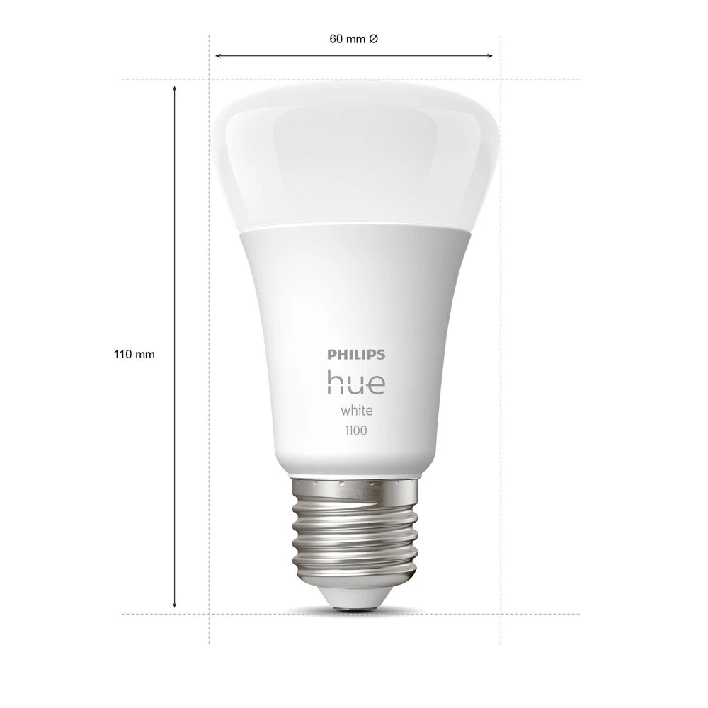 - Füge Deinem Beleuchtungssystem zwei Philips Hue White Standard-Lampen mit E27-Sockel hinzu und bereichere Dein Zuhause mit intelligentem warmweißem LED-Licht. Mit 1100 Lumen entsprechen sie 75-Watt-Lampen. Es ist eine intime Atmosphäre gewünscht? Dimme das Licht und genieße genau das richtige Maß an Licht. Steuere bis zu 10 Lampen mittels der Bluetooth-Funktion in der App und dimme alle Lampen blitzschnell. Koppele sie mit einer Hue Bridge, um alle intelligenten Funktionen zu nutzen, wie Timer, Automatisierungen oder die Steuerung der Beleuchtung, wenn Du nicht zu Hause bist.